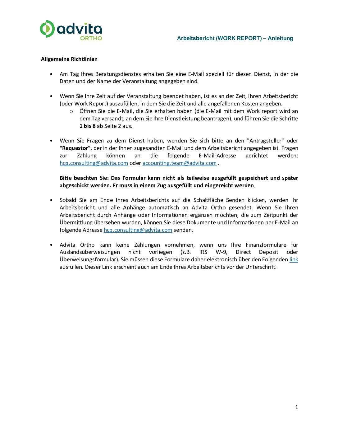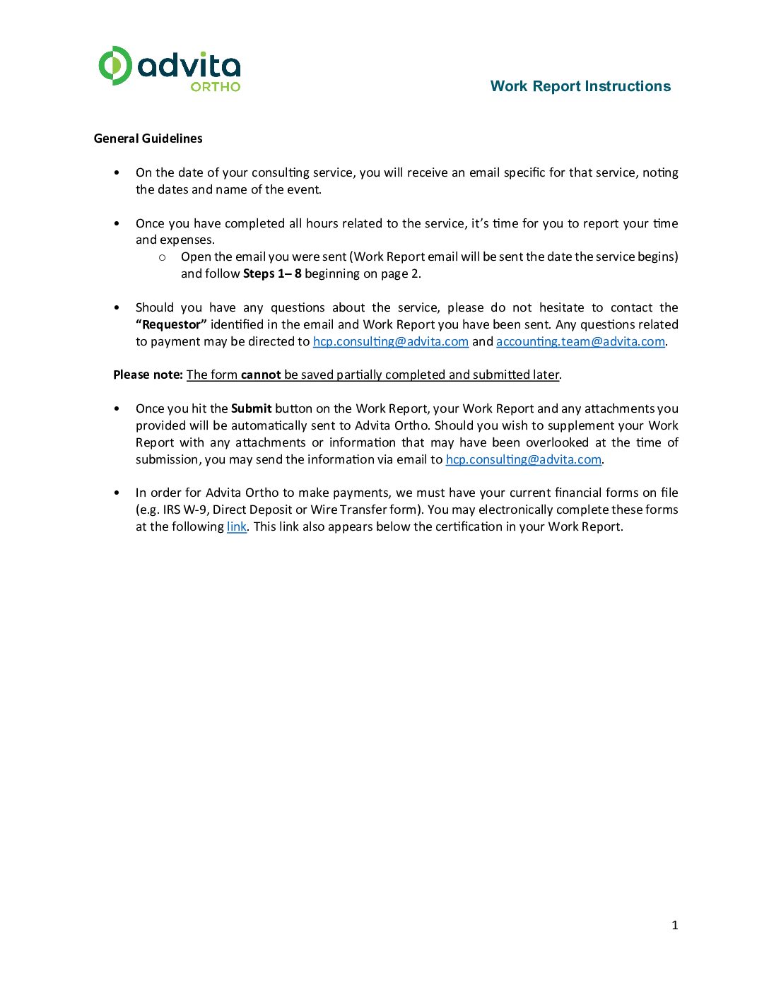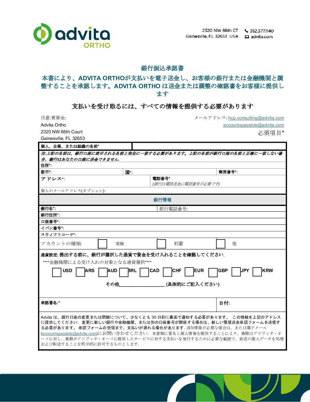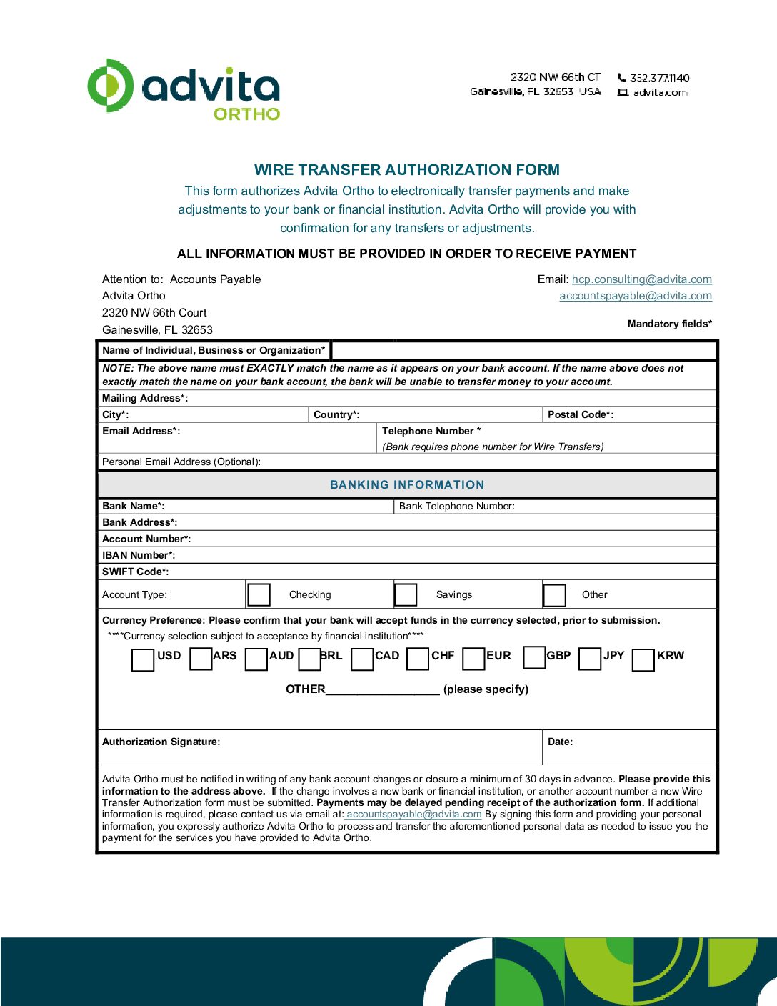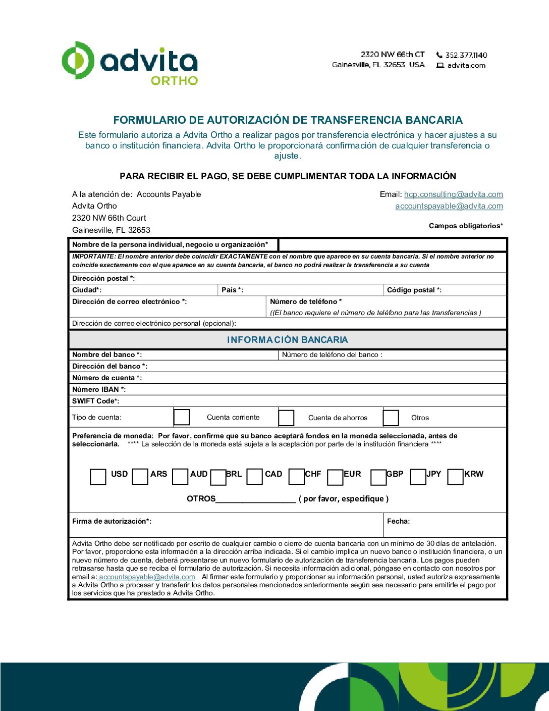 In order for Advita Ortho to process payments to you, we must have the appropriate tax form and bank form, if wired or direct deposited into your account. Advita will be unable to process any payment to you if these forms are not completed, legible (typed) and on file.
