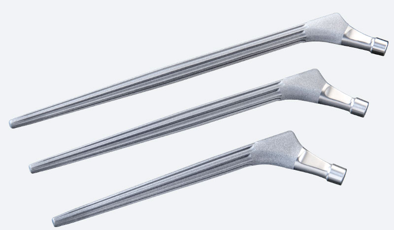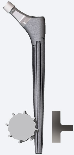 A press-fit, distally fixed, one-piece tapered, splined titanium stem.