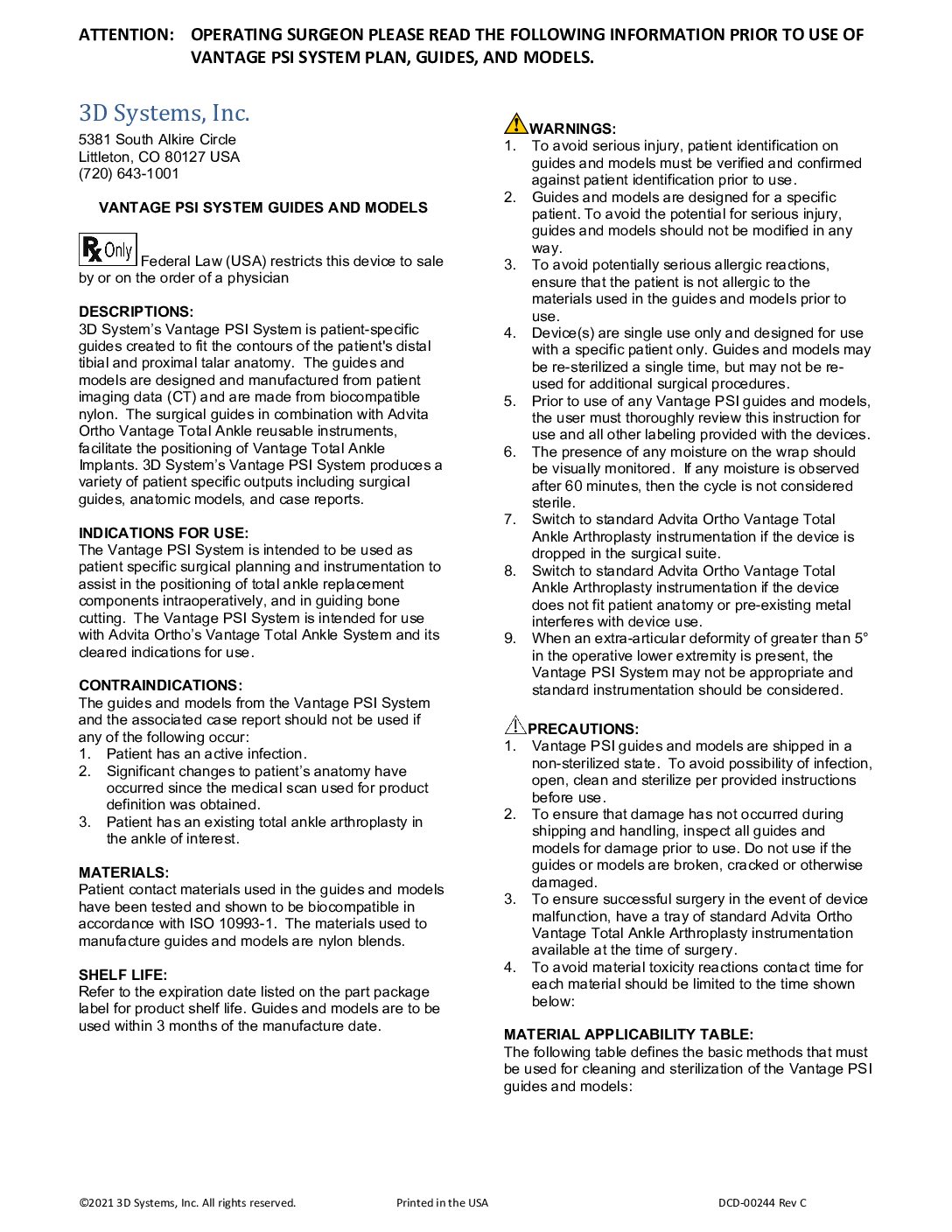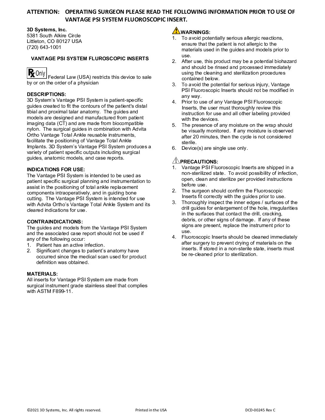 Vantage Ankle PSI System Fluoroscopic Inserts Sterilization