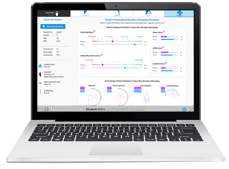 Predict+ is the world’s first clinical decision support tool that leverages predictive analytics and machine learning algorithms to deliver patient-specific outcome predictions for shoulder replacement surgery. Predict+ assists with patient selection, implant selection and patient experience and satisfaction. It will revolutionize the preoperative consultation process with additional evidence-based treatment decisions that can more accurately establish patient expectations for shoulder arthroplasty.